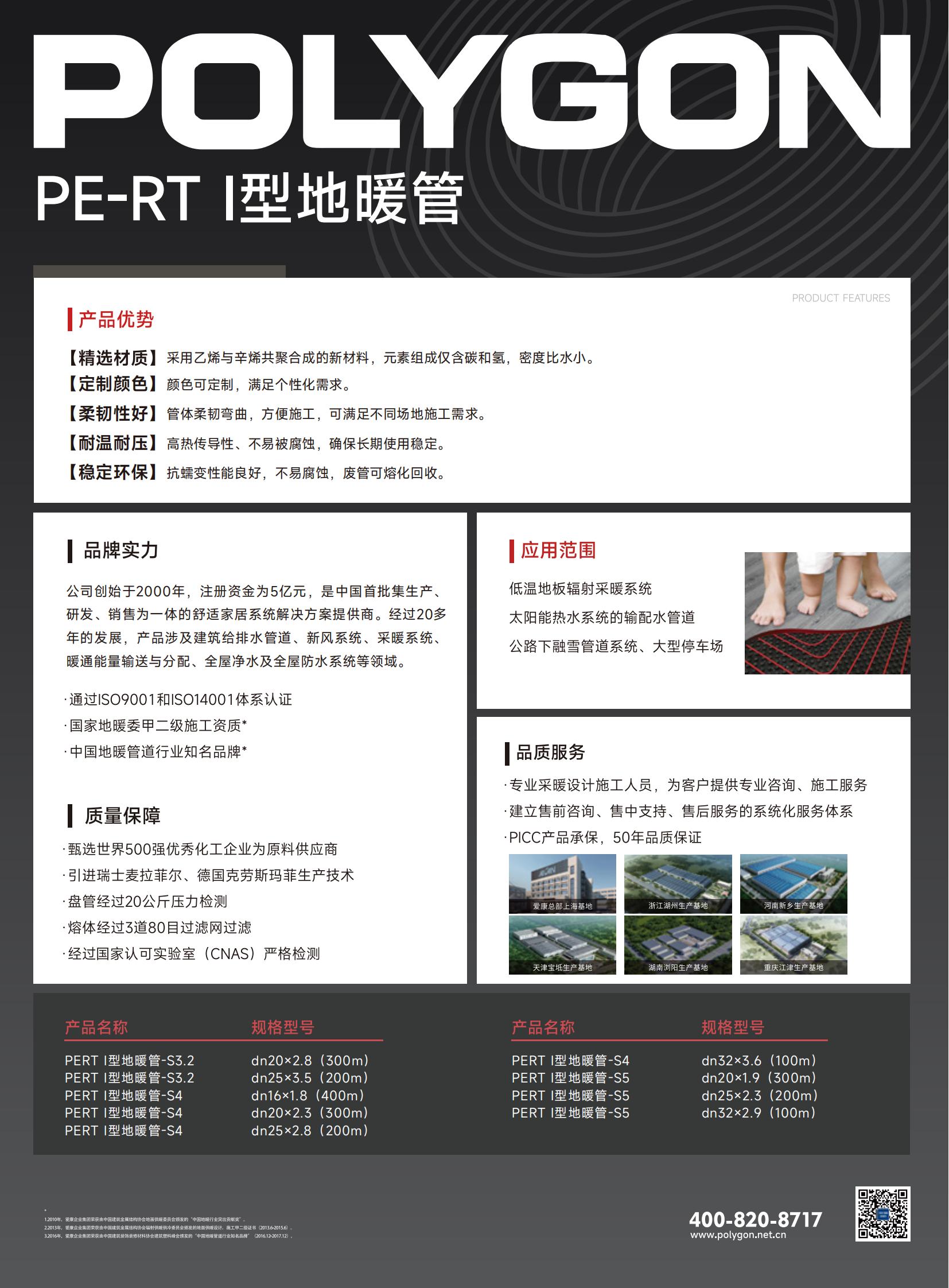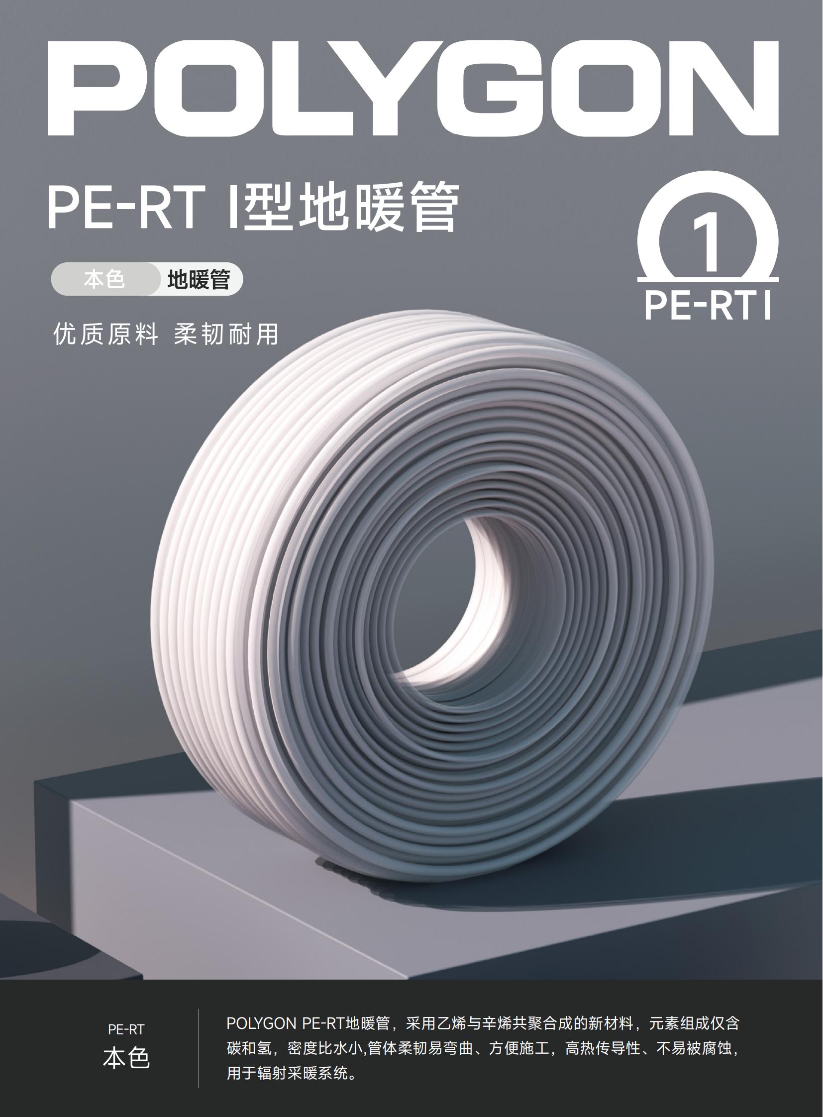 POLYGON PE-RT地暖管,采用乙烯与辛烯共聚合成的新材料,元素组成仅含碳和氢,密度比水小,管体柔韧易弯曲、方便施工,高热传导性、不易被腐蚀用于辐射采暖系统。