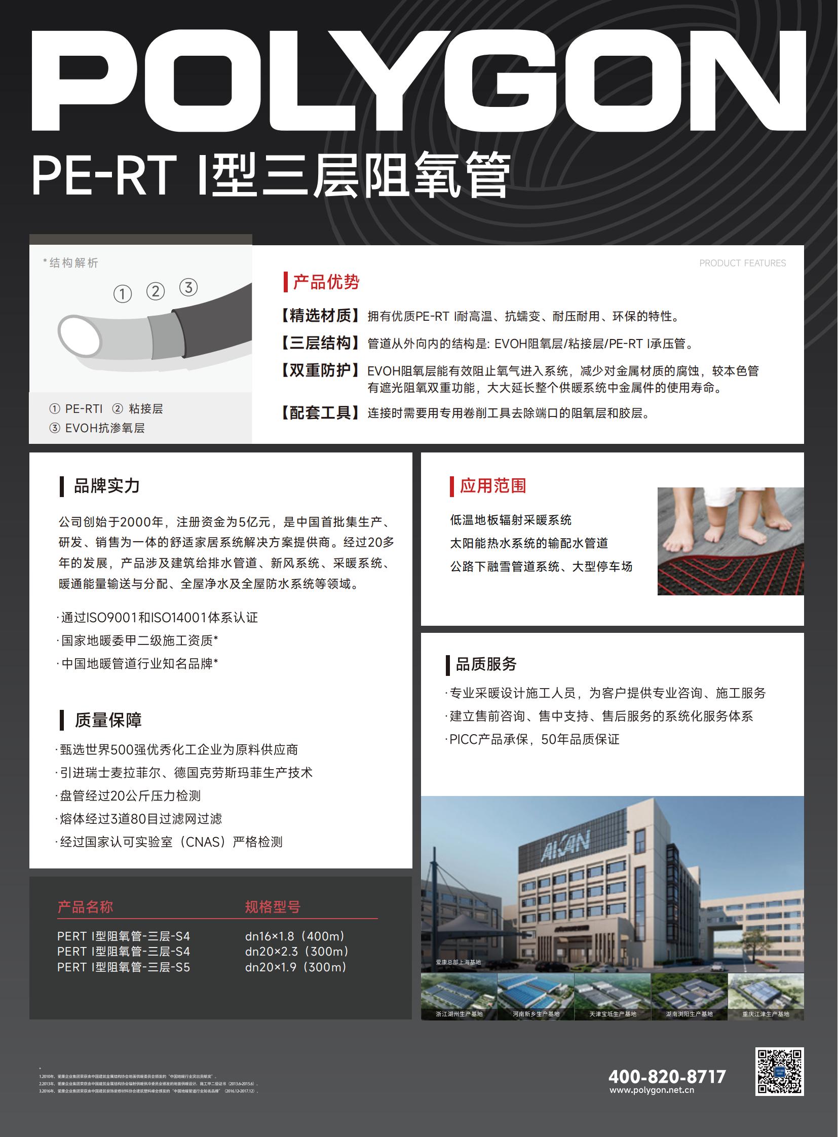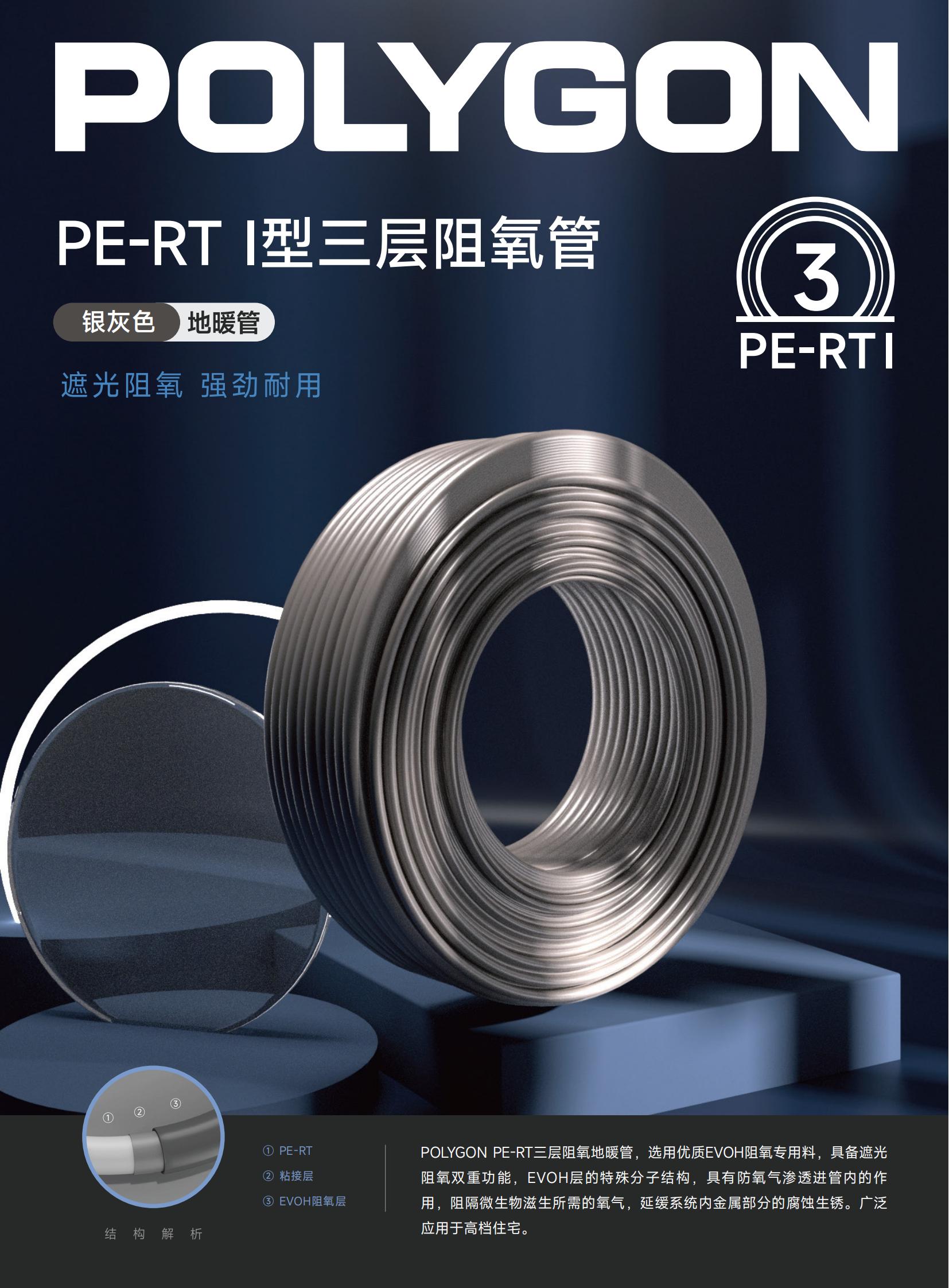 POLYGON PE-RT三层阻氧地暖管,选用优质EVOH阻氧专用料,具备遮光阻氧双重功能,EVOH层的特殊分子结构,具有防氧气渗透进管内的作用,阻隔微生物滋生所需的氧气,延缓系统内金属部分的腐蚀生锈。广泛应用于高档住宅。