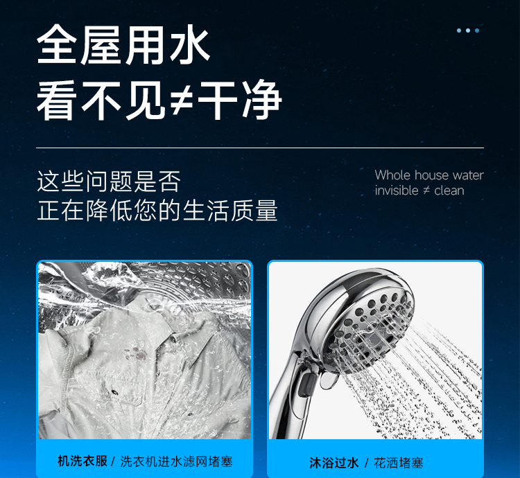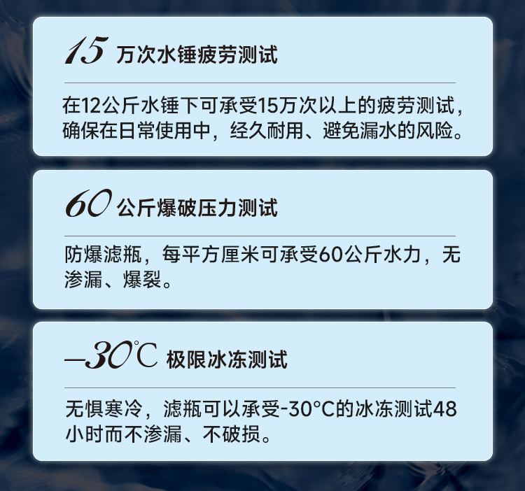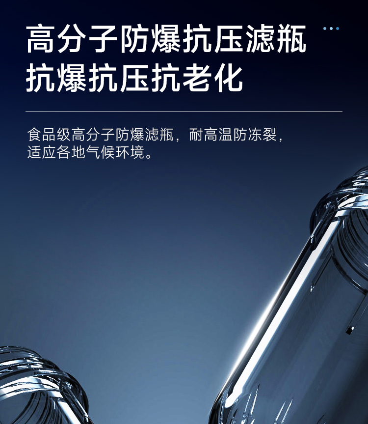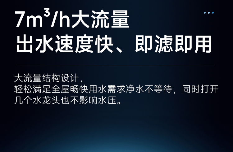 7m3/h大流量,出水速度快、即滤即用;大流量结构设计,轻松满足全屋畅快用水需求,净水不等待,同时打开几个水龙头也不影响水压。